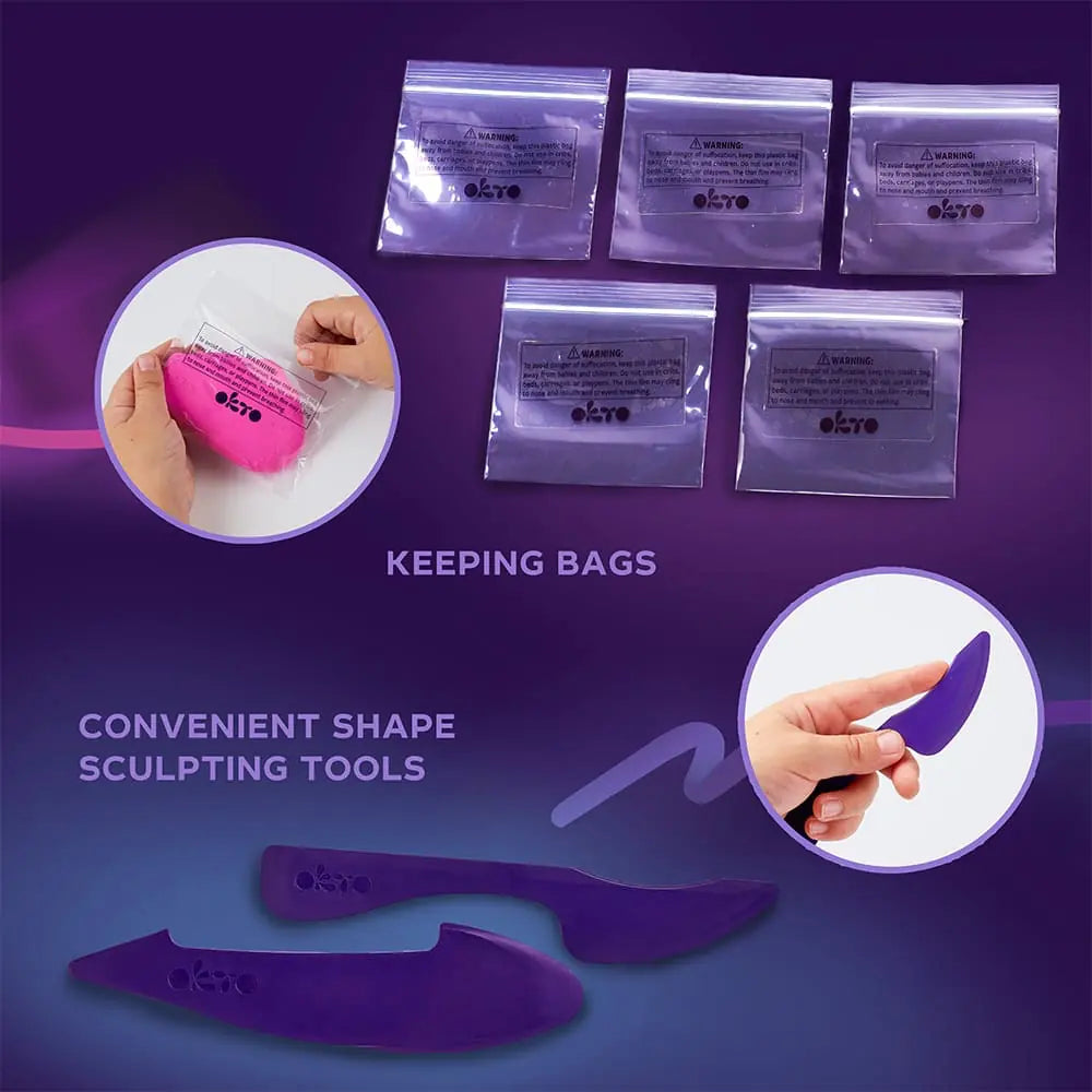 - Zestaw zawiera: 24 szt. plasteliny, książeczkę z ilustracjami, 2 szt. narzędzi do obróbki detali, torebki do przechowywania oraz 2 szt. okularów.