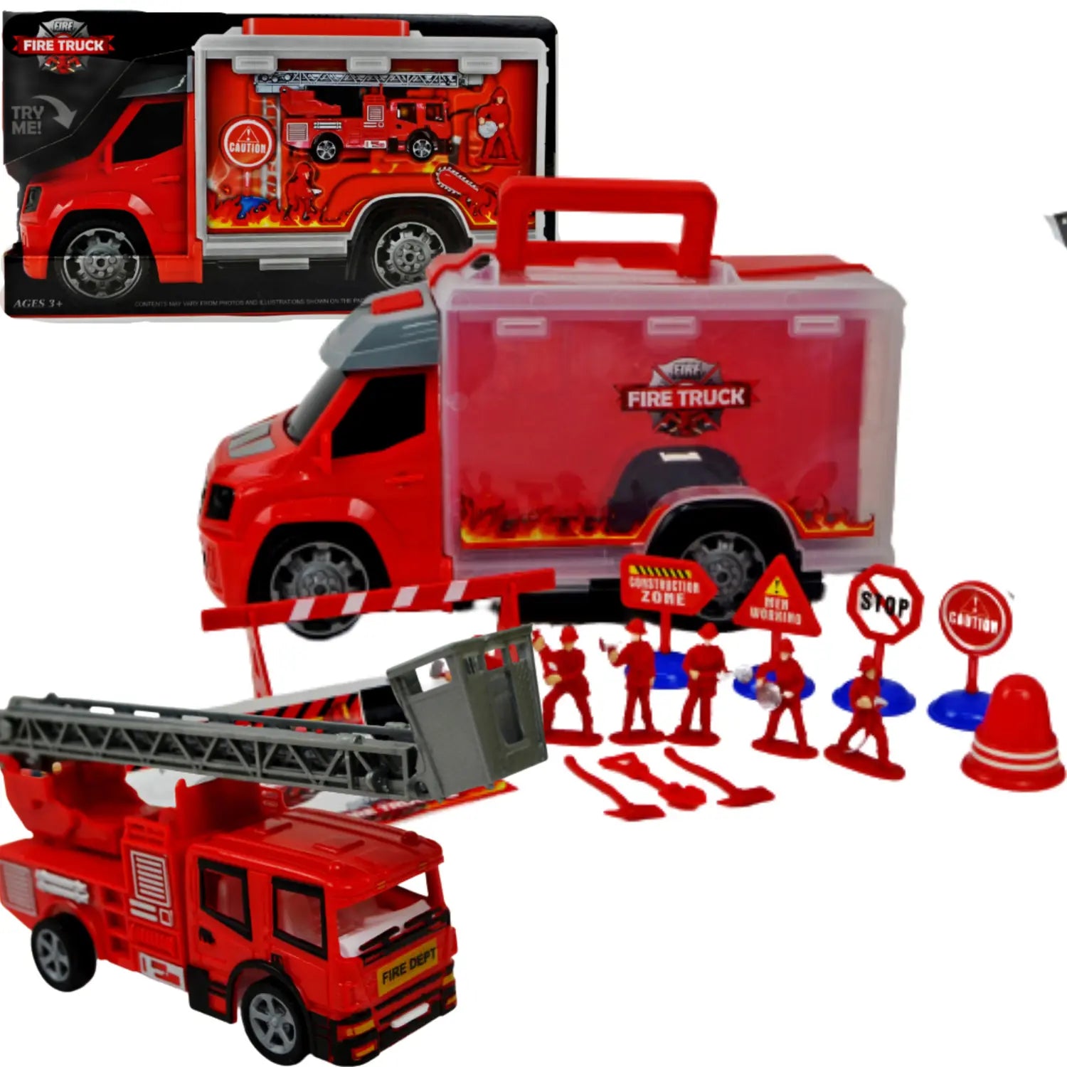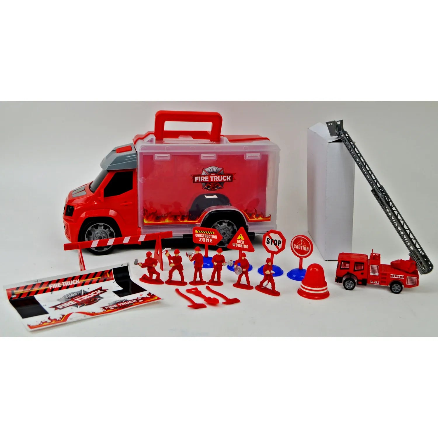Zestaw składa się z głównego wozu transportowego z czerwoną kabiną i przezroczystą skrzynią ładunkową, w której można przechowywać wszystkie elementy. W zestawie znajduje się również mniejszy wóz strażacki z drabiną, figurki strażaków, znaki drogowe, pachołki oraz inne akcesoria niezbędne do organizacji akcji ratunkowych. Wszystkie elementy wykonane są z wysokiej jakości plastiku, bezpiecznego dla dzieci. Zabawka rozwija wyobraźnię, koordynację wzrokowo-ruchową oraz umiejętności społeczne podczas zabawy w grupie. Idealny do zabawy w domu, przedszkolu czy na podwórku.
