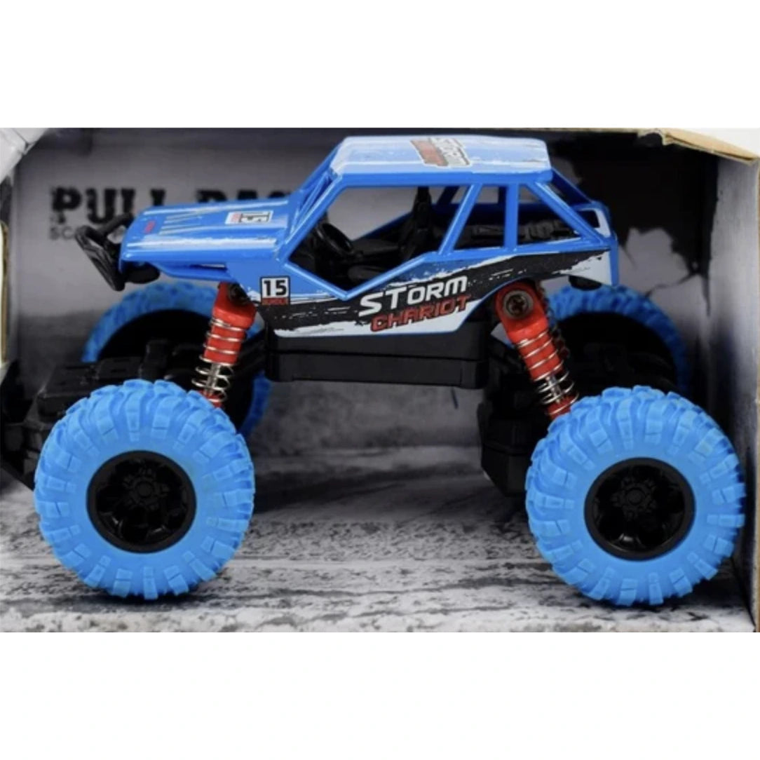 STORM CHARIOT to zaawansowany model samochodu zdalnie sterowanego, wyposażony w masywne niebieskie opony terenowe i solidne zawieszenie z czerwonymi amortyzatorami. Pojazd charakteryzuje się wytrzymałą konstrukcją z wysokiej jakości materiałów, zapewniającą długotrwałą zabawę. Samochód posiada realistyczne detale, w tym numerację startową "15" i sportowe malowanie. Dzięki napędowi na cztery koła doskonale radzi sobie na różnych powierzchniach - od asfaltu po piasek i trawę. Model wyposażony jest w system pull-back, umożliwiający łatwą zabawę bez konieczności używania baterii.