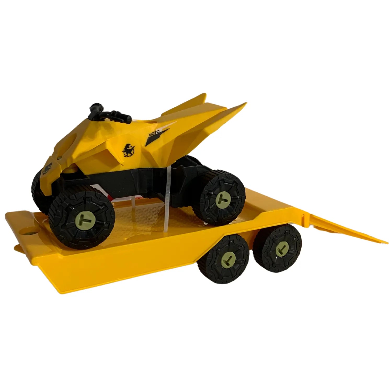 Samochód z przesuwaną przyczepą to główny element zestawu. Wyposażony w ruchome części, samochód oferuje pełen zakres zabawy. Koła pojazdu można samodzielnie wkręcać i wykręcać, co rozwija zdolności motoryczne dziecka. Przyczepa zawiera quad oraz czołg, które również posiadają elementy do montażu i demontażu.
