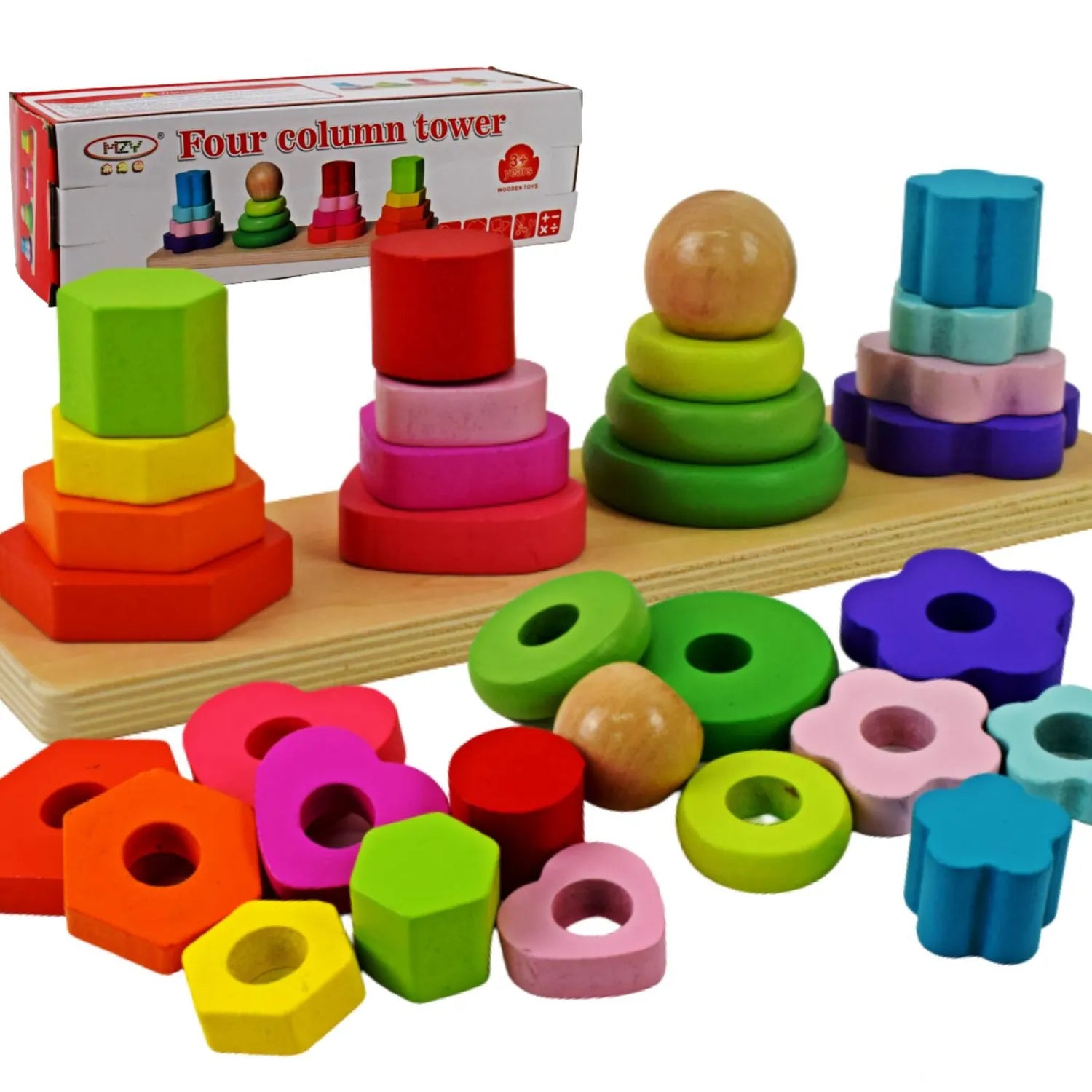 Kolorowa zabawka edukacyjna Four column tower to doskonały sposób na rozwijanie umiejętności motorycznych i logicznego myślenia u najmłodszych. Zestaw składa się z drewnianej podstawy z czterema słupkami oraz różnokolorowych elementów do układania.