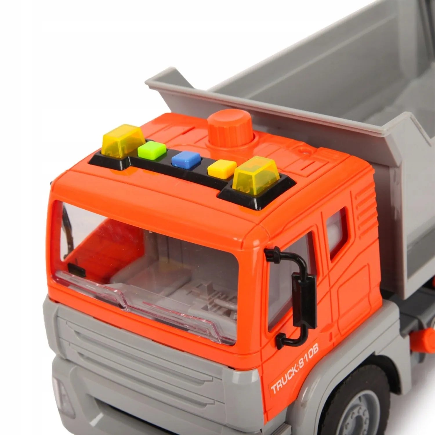 Ця унікальна вантажівка виготовлена з високоякісного міцного пластику яскраво-помаранчевого та сірого кольорів. Транспортний засіб має функціональну вантажну платформу, яку можна піднімати та опускати, імітуючи справжній самоскид. Дах кабіни має барвисті елементи, що нагадують світлофори, що додає іграшці реалістичності. Прозорі вікна кабіни дозволяють зазирнути в салон автомобіля. Міцні колеса забезпечують плавне переміщення по різних поверхнях. Ця іграшка розвиває дитячу уяву, координацію рук і очей та дрібну моторику під час рольових ігор на будівельному майданчику.
