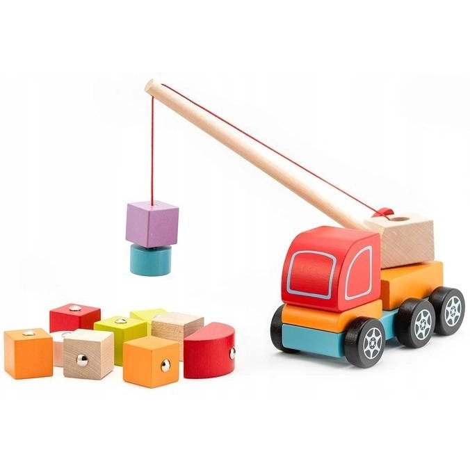 Дерев'яна розвиваюча іграшка CRANE від CUBIKA - це набір з 14 елементів, що містить машинку з підйомним краном та різнокольорові блоки.