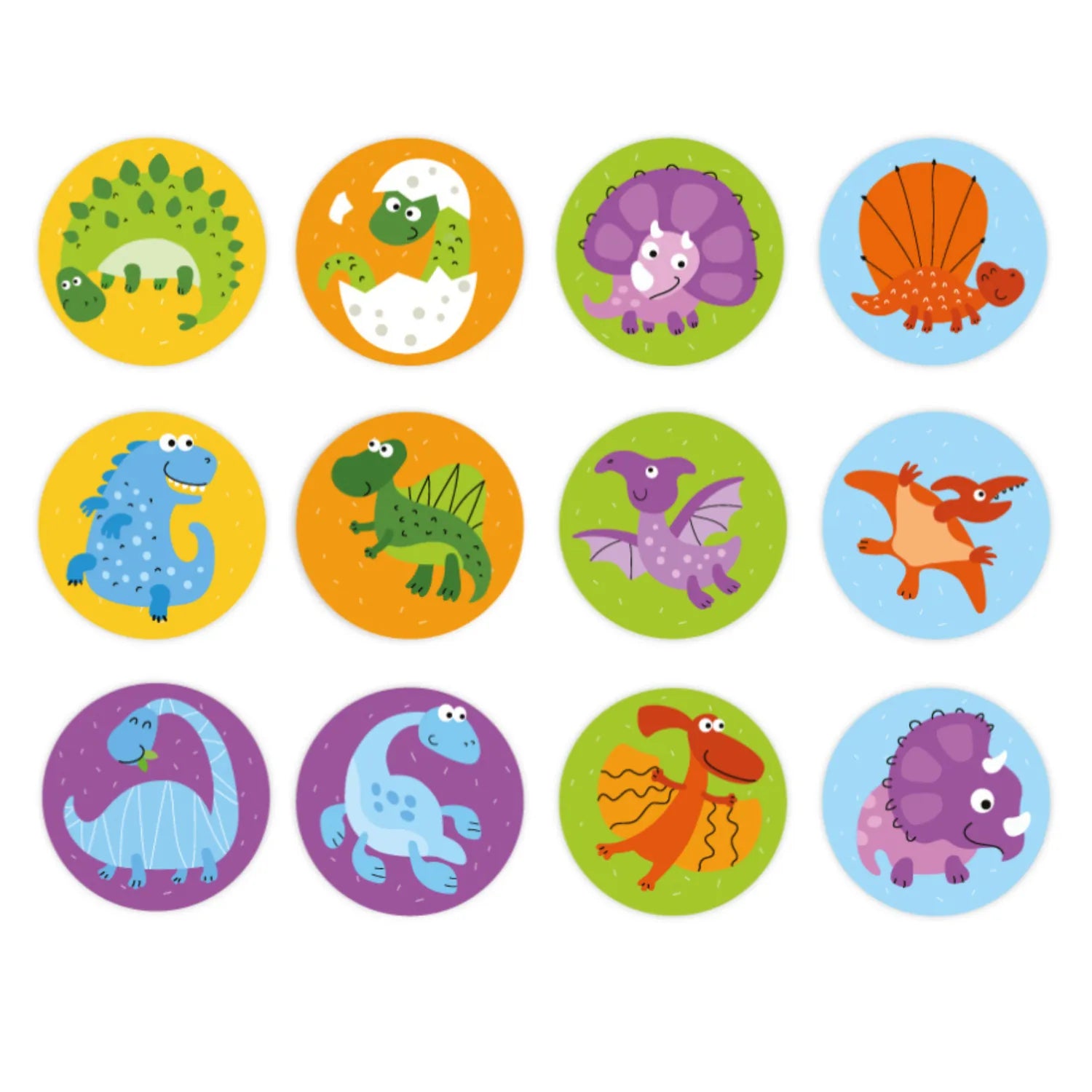 Набір містить 24 ігрові картки – кожна пара карток зображує різних динозаврів, створюючи 12 захопливих пар.