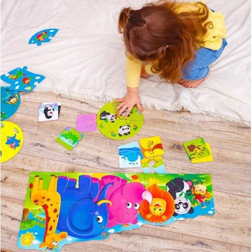 1. Перший набір містить яскраві та барвисті круглі пазли . Їх складання – це не лише веселе, але й складне заняття, яке дозволяє дітям розвивати уяву, логічне мислення та дрібну моторику. Складаючи ці пазли, діти навчаться розрізняти дорослих тварин та їхніх дитинчат.
