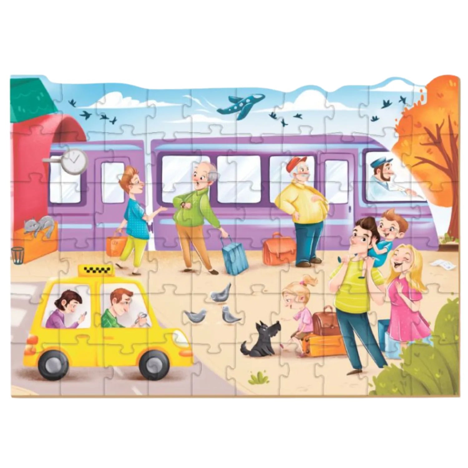 Пазл «Залізнична станція» складається з 60 високоякісних деталей, виготовлених з міцного картону. Готове зображення зображує захопливу сцену залізничної станції з фіолетовим поїздом, жовтим таксі та різноманітними барвистими персонажами — від мандрівників з валізами до дітей, які граються на платформі. Пазл розвиває концентрацію, логічне мислення та координацію рук і очей. Великі деталі безпечні для маленьких ручок, а яскраві кольори та детальні ілюстрації заохочують до тривалої гри. Після складання пазл можна використовувати як прикрасу для дитячої кімнати. Виріб легко зберігати завдяки міцній коробці з ручками.