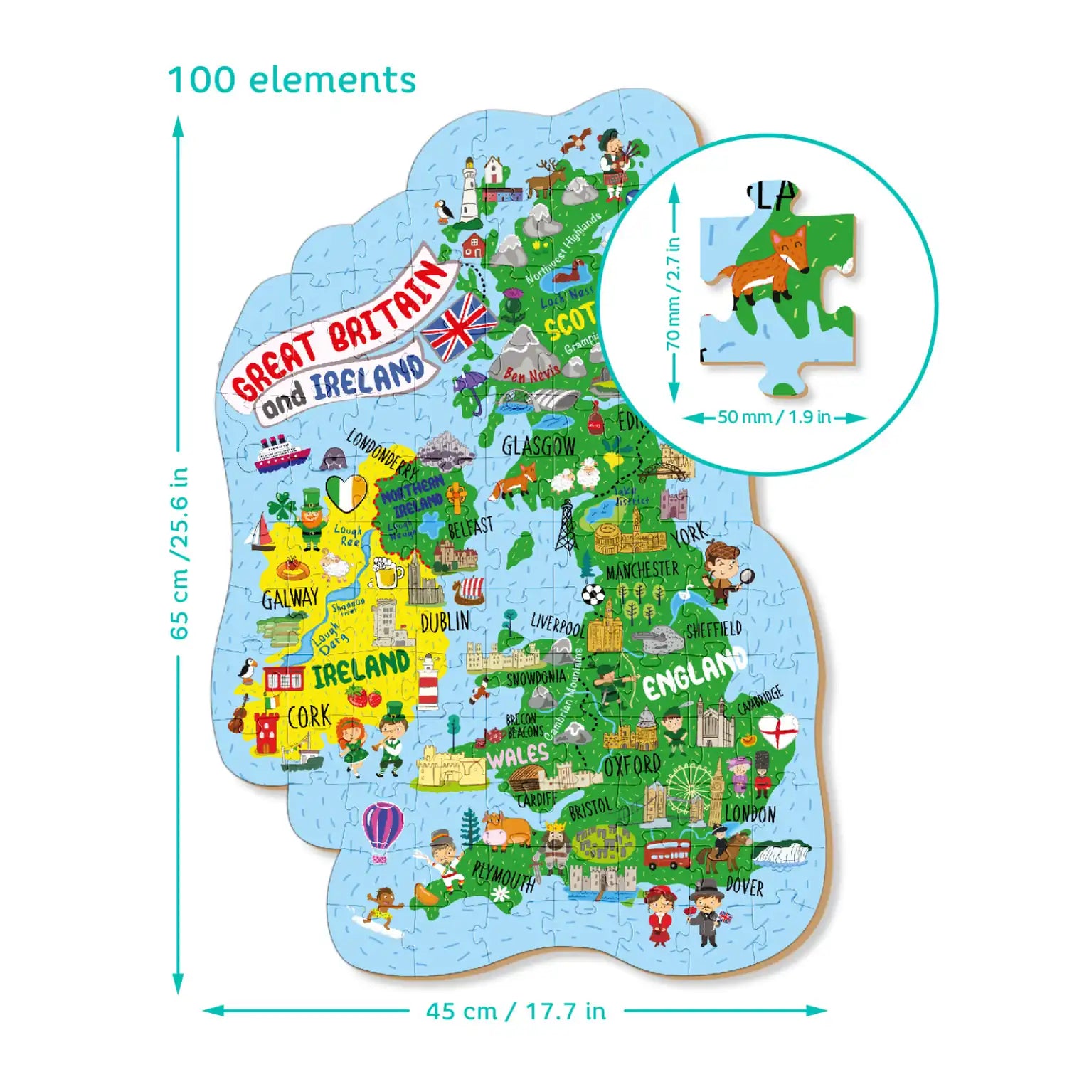 Ми запрошуємо маленьких дослідників у захопливу подорож з нашими пазлами з картами Великої Британії та Ірландії. Цей набір зі 100 елементів — це не просто пазл, а й пізнавальна пригода, яка розвиває інтерес до географії та різноманітності цієї країни.