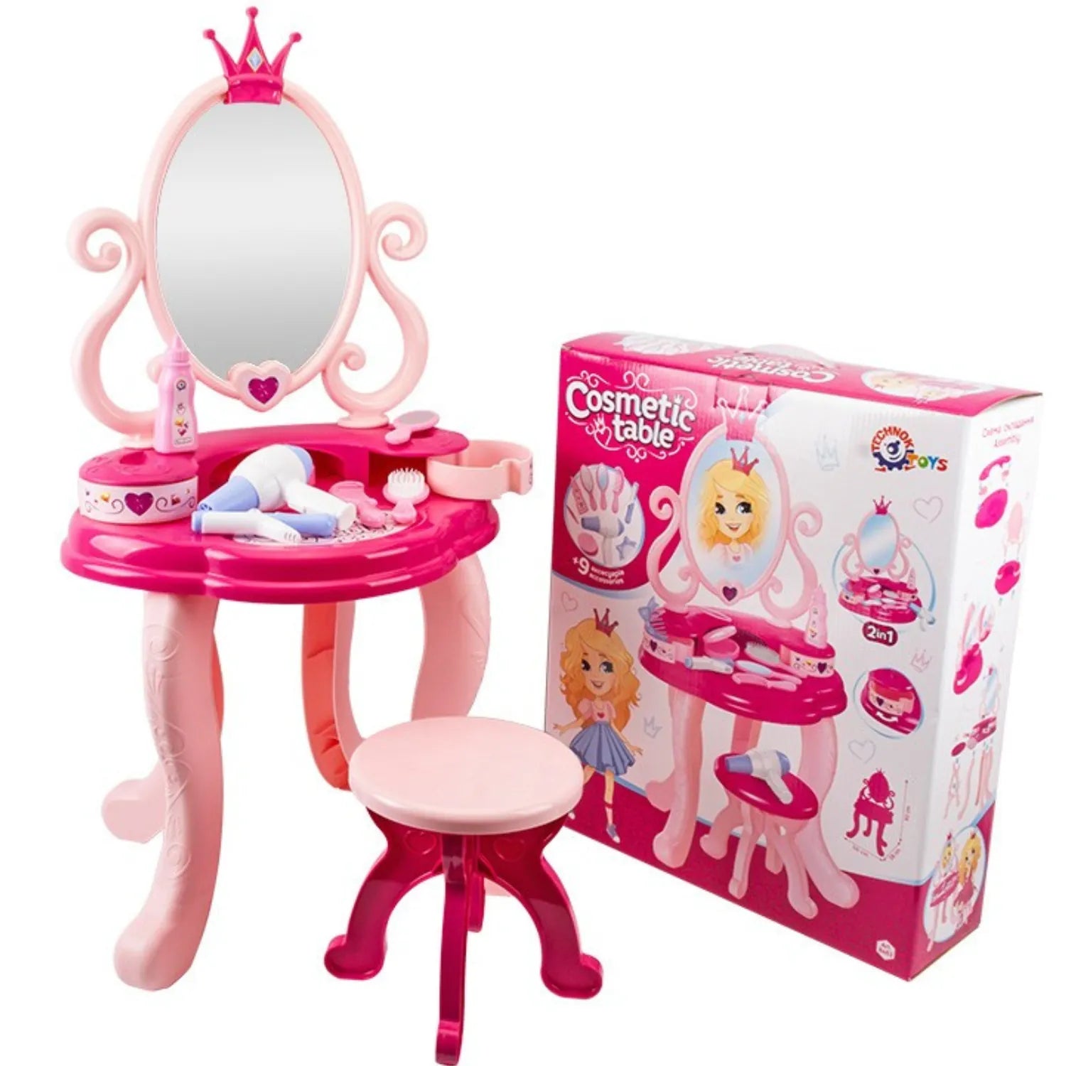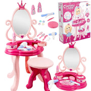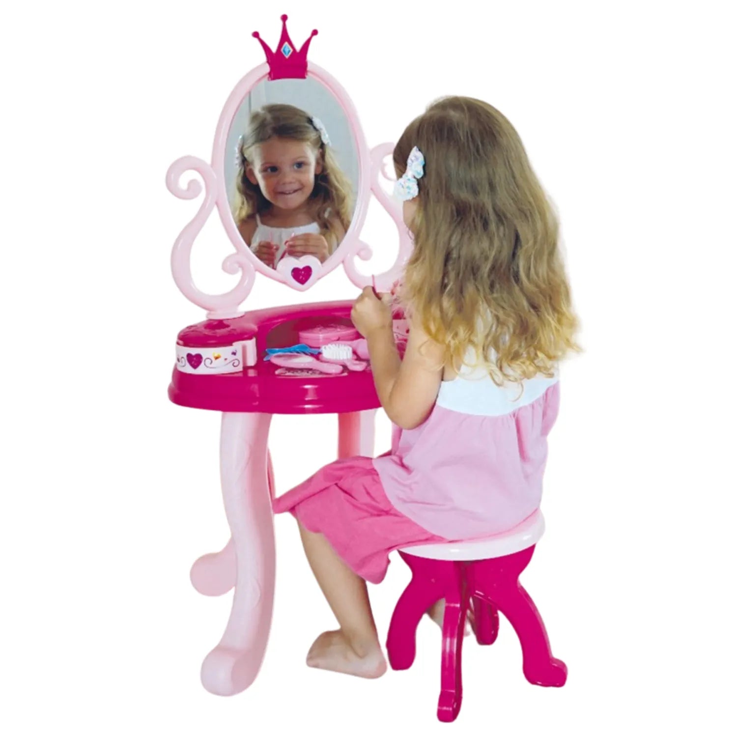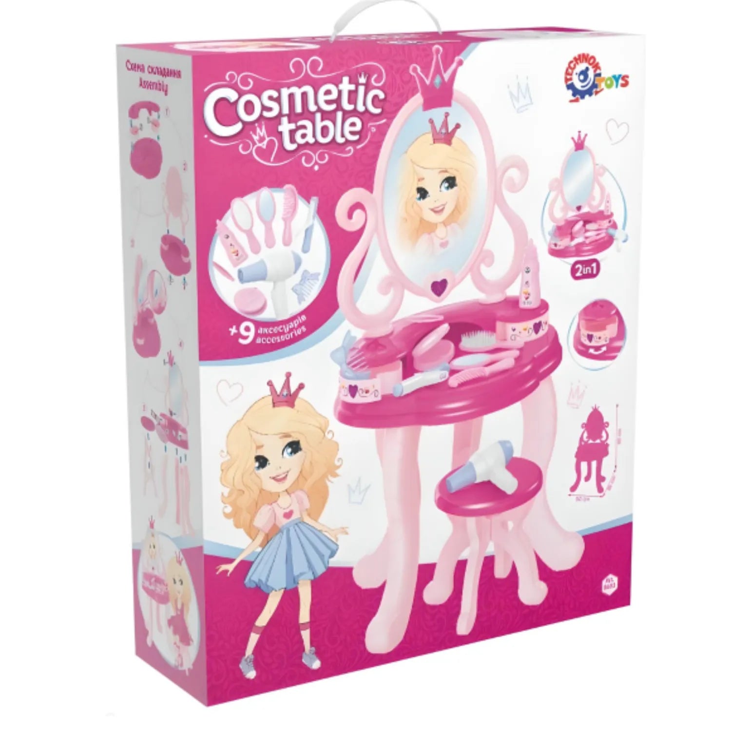 Косметичний столик – ідеальний подарунок для будь-якої маленької леді, яка любить вбиратися та гратися в салон краси. Набір включає елегантний туалетний столик з великим овальним дзеркалом, прикрашеним короною, зручний стілець та дев'ять різноманітних косметичних аксесуарів. Дзеркало регулюється, а всі елементи виготовлені з високоякісного, безпечного пластику в красивих відтінках рожевого та фуксії. Ця іграшка розвиває уяву, креативність та соціальні навички під час рольової гри. Міцна конструкція забезпечує тривалу гру, а простий механізм складання дозволяє зручно зберігати.
