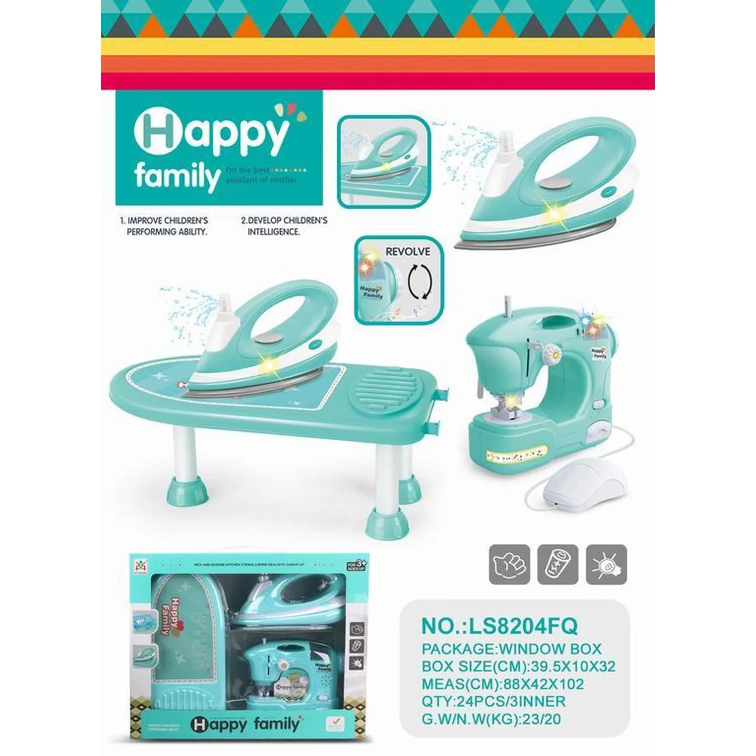 Набір «Щаслива родина» – це чудова розвивальна іграшка, яка поєднує в собі розваги з вивченням повсякденних навичок. Праска має функцію обертання та реалістичні звуки, а прасувальна дошка має стійкі ніжки для безпечної гри. Швейна машинка з обертовим колесом та рухомою голкою дозволяє дітям вивчити основи кравця. Усі компоненти виготовлені з високоякісних, безпечних матеріалів приємного м’ятного кольору. Ця іграшка розвиває координацію рук і очей, уяву та соціальні навички, імітуючи дорослих.