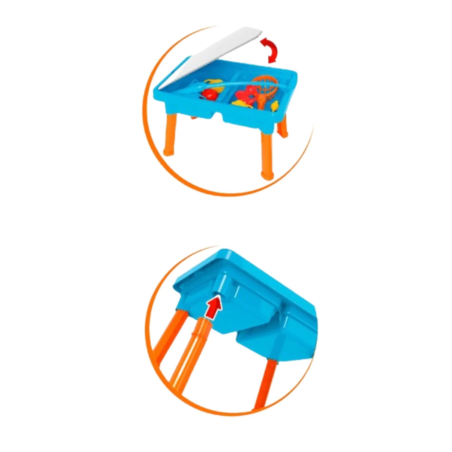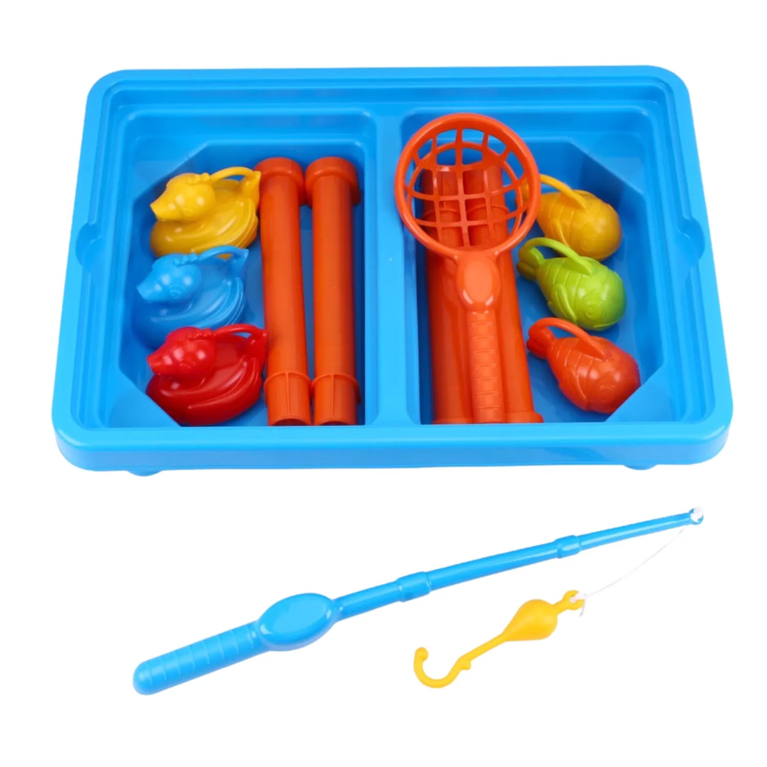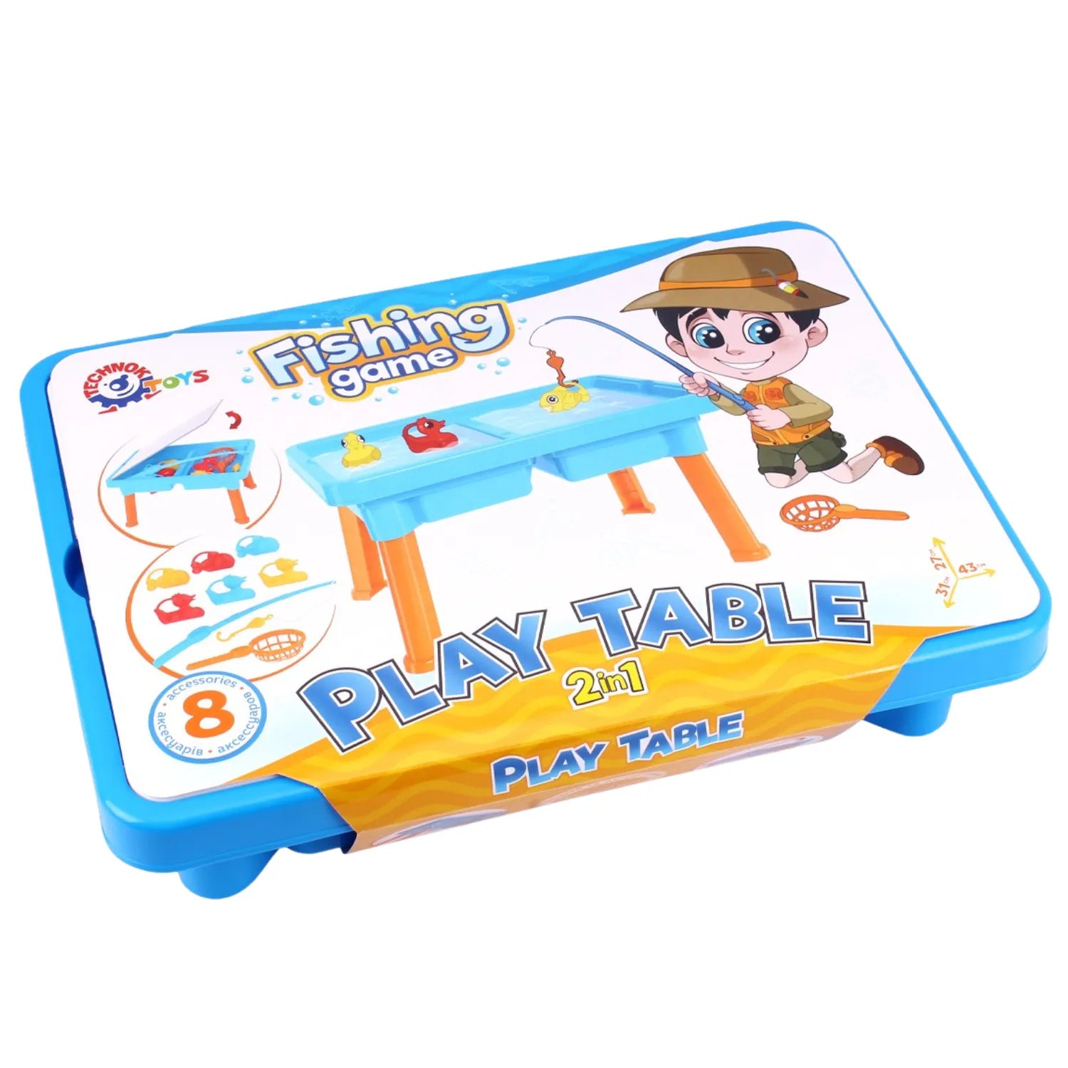 Рибальський набір , який є невід'ємною частиною столу, – це справжня пригода для малюків. Знявши чохол зі столу, діти переносяться у надзвичайний водний світ, перетворюючись на справжніх рибалок. Набір містить усе необхідне для початку пригод: вудку, підсак, а також різнокольорових качок і рибок.