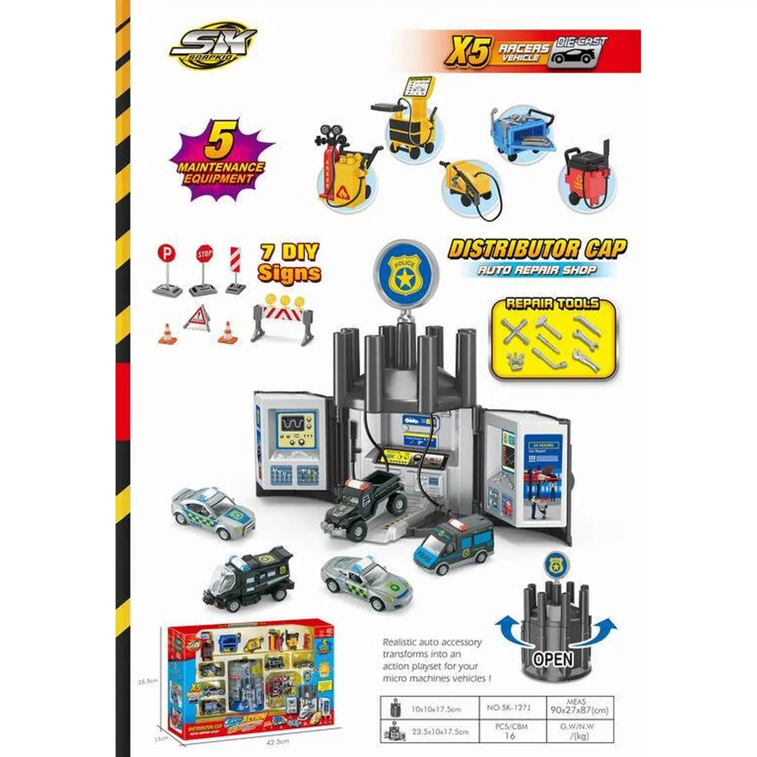 Набір «Авторемонтна майстерня» – це повноцінна іграшка для юних шанувальників автомобілів та поліцейських машин. Набір включає п’ять литих металевих машинок, реалістичні аксесуари для майстерні, дорожні знаки та набір інструментів для ремонту автомобілів. Майстерня, яка відкривається та виглядає як футуристична станція технічного обслуговування, переносить дітей у світ творчої гри, розвиваючи уяву, ручні навички та координацію рук і очей. Міцна конструкція та детально продумані деталі роблять гру ще більш реалістичною. Упакована в барвисту коробку розміром 42,5 x 28,5 x 10,5 см, іграшка стане ідеальним подарунком, а сама іграшка в розкладеному вигляді має розміри 29,5 x 10,7 x 17,5 см.