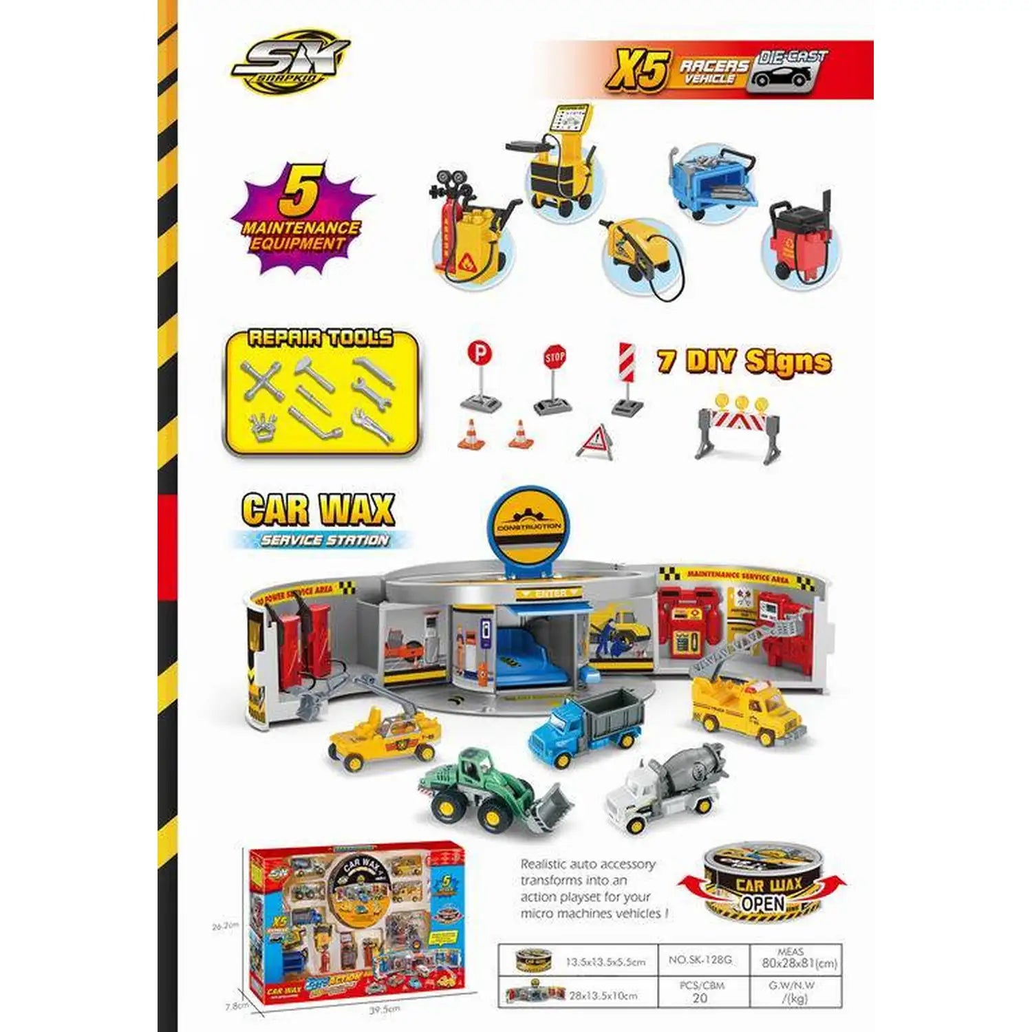 Набір містить повноцінну станцію технічного обслуговування з обертовою платформою, яка трансформується в ігровий майданчик для мініатюрних транспортних засобів. Набір містить п'ять різних робочих машин, інструменти для ремонту, дорожні знаки, що можна зробити самостійно, та обладнання для технічного обслуговування. Високоякісна конструкція забезпечує безпечну гру, а різноманітні елементи розвивають дитячу уяву та ручні навички. Станція має функціональні елементи, такі як пандуси, платформи та паркувальні місця.